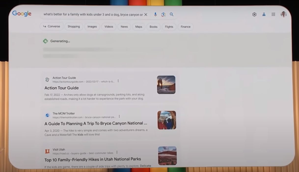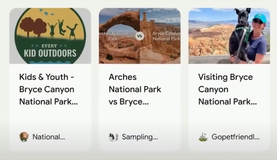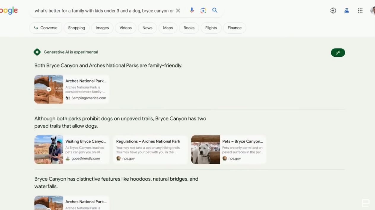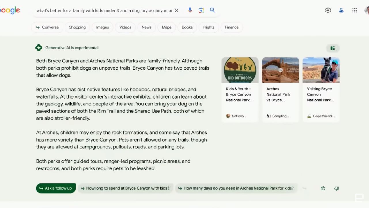 For example, let’s start with a search for “What’s better for a family with kids under three and a dog Bryce Canyon or Arches” now,