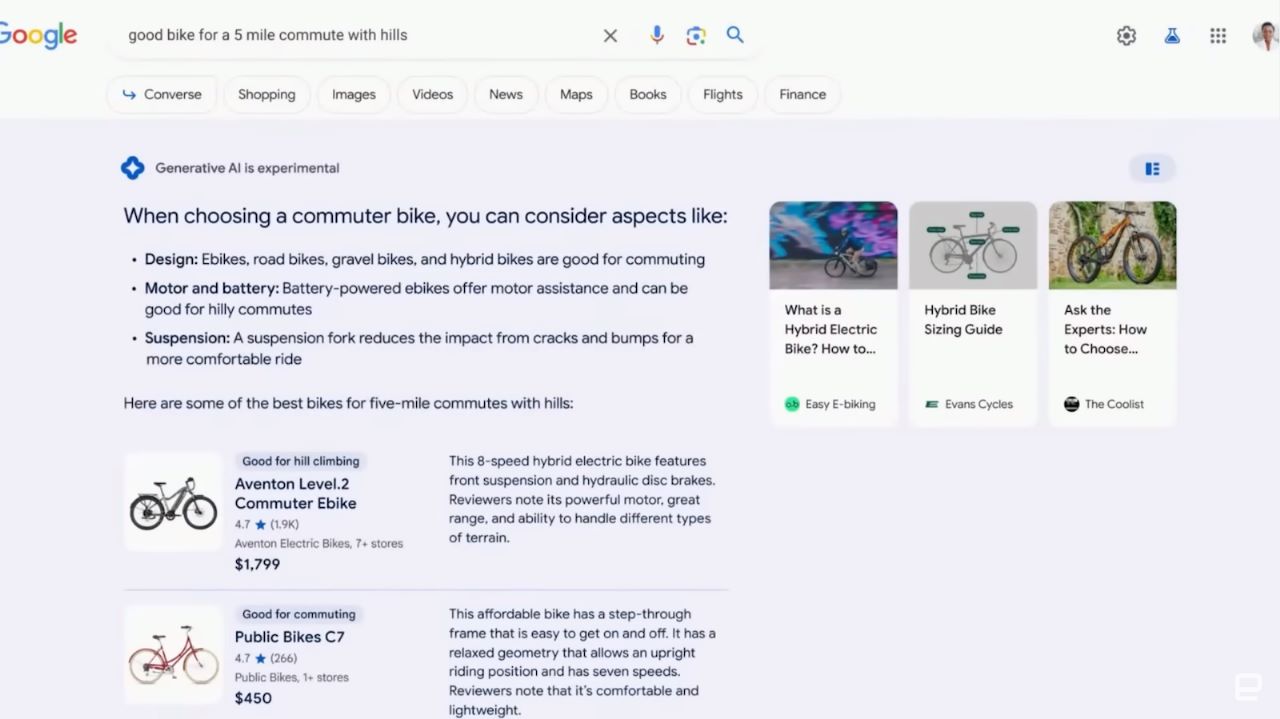 let’s say you’re searching for “a good bike for a five-mile commute with hills”.